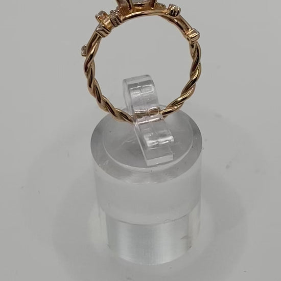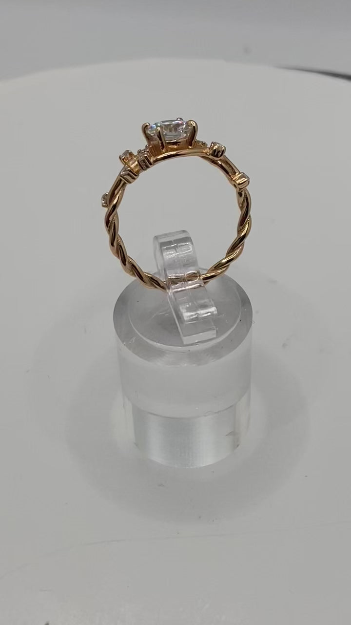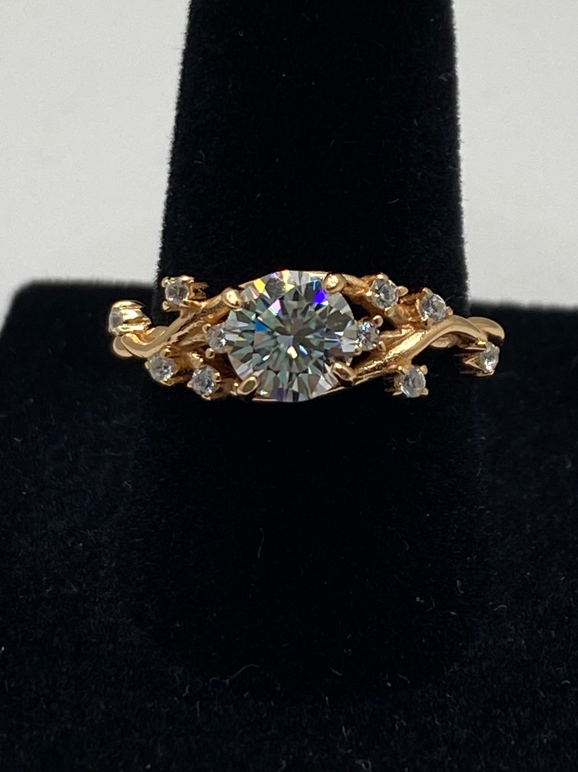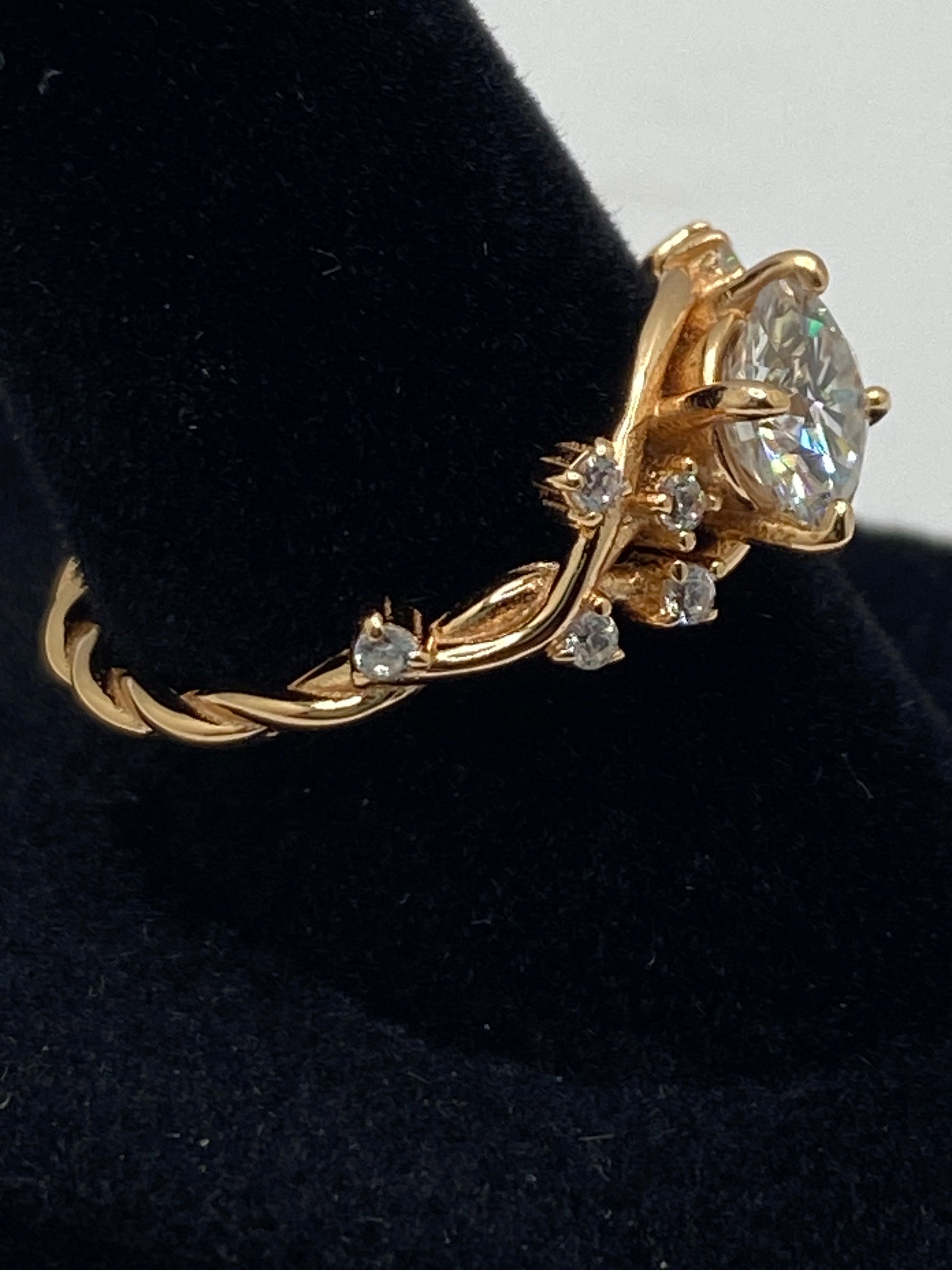 Meet Blossom a whimsical 18K rose gold over 925 silver ring featuring a 1-carat VVS1 moissanite center stone, diamond tested for brilliance. Twisting vine details with sparkling accents create a romantic, fairytale charm. Available in sizes 6 and 7.