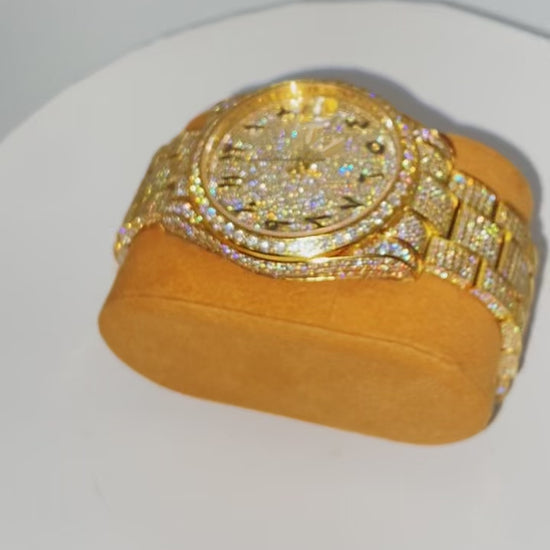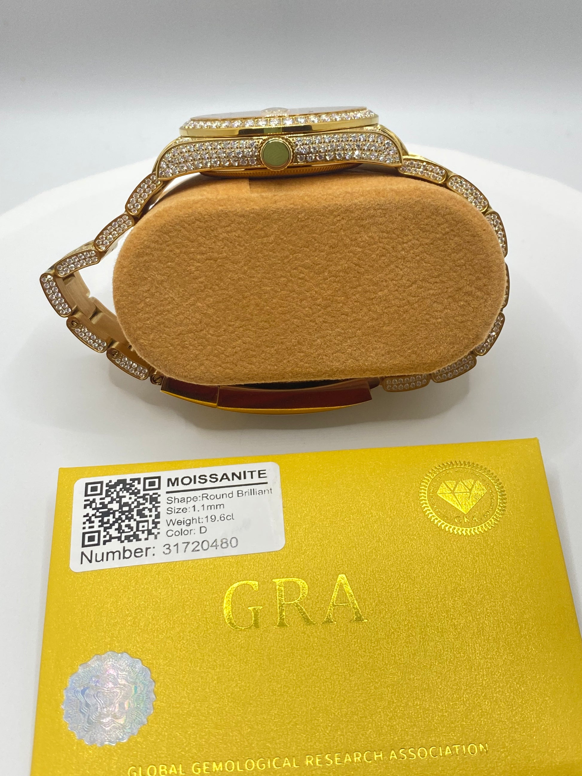 This opulent Arabic Dial Gold Icy Moissanite Watch is designed with expert craftsmanship to exude both luxuriousness and accuracy. Adorned with exquisite, unblemished moissanite stones weighing a remarkable 19.6 carats, this timepiece is complemented by an elegant Arab dial in stainless steel, adding a touch of refinement to any attire. Ideal for those with a keen eye for superior quality and fashionable taste. Features a heavy 316L stainless steel construction, sapphire glass face, and a 41mm watch face.