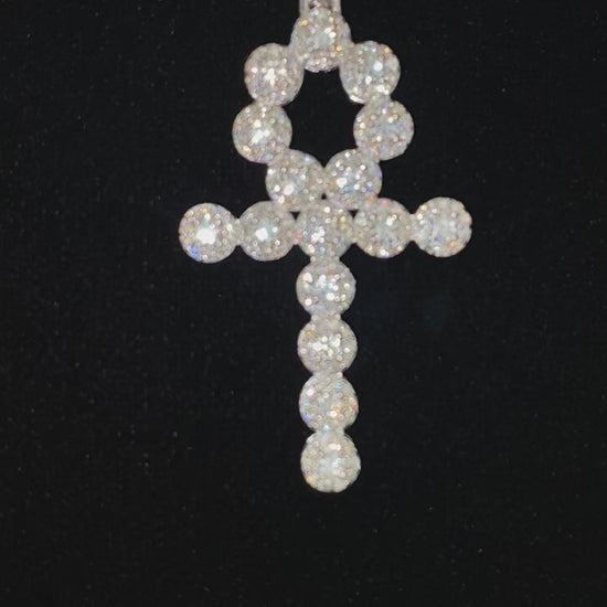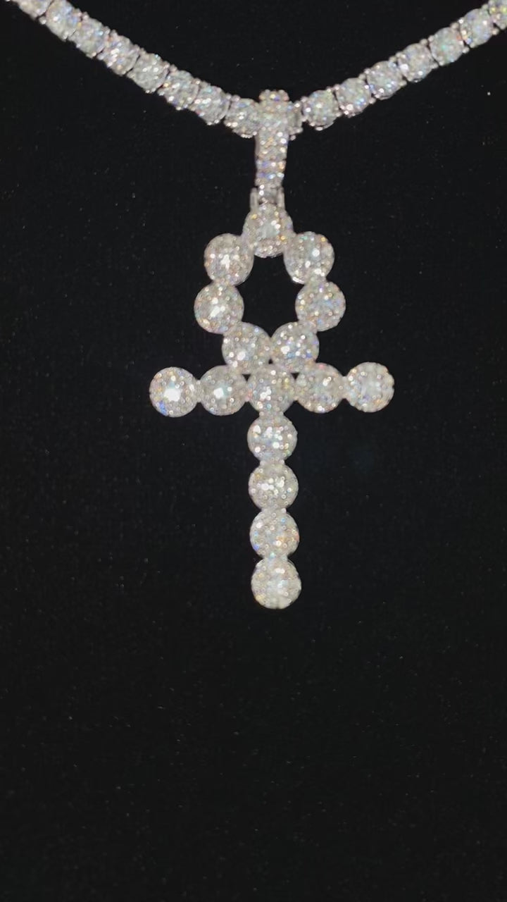 Crafted with a timeless elegance and rich symbolism, this stunning pendant captures the essence of the Ankh cross, an ancient Egyptian symbol of eternal life. Handset with premium VVS1 clarity, D color moissanite stones, this piece boasts unparalleled brilliance and fire that rivals natural diamonds. The bold design features 16 round cuts, expertly crafted and set in solid 925 sterling silver. Rest assured, this pendant is diamond tester approved for guaranteed quality.