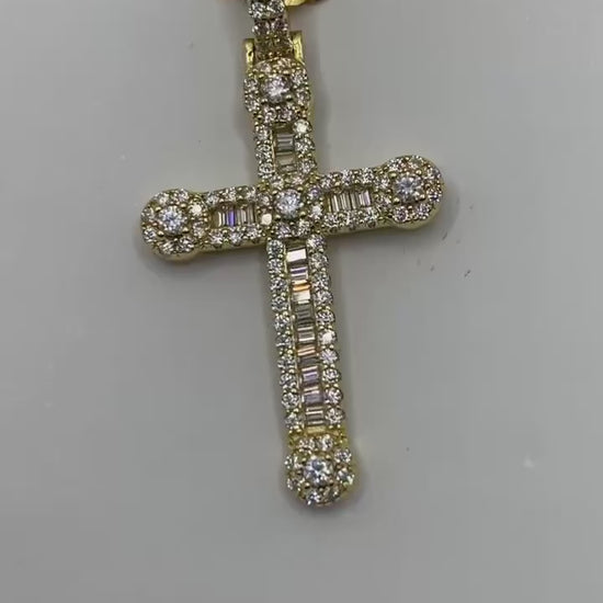 Embrace your faith with our stunning Cross pendant, featuring sparkling moissanite stones and a 14k gold over silver finish. The perfect blend of elegance and spirituality, it comes with a 2mm 18k gold over silver Cuban chain to complete the look. Make a statement with our Cross with Baguettes set.