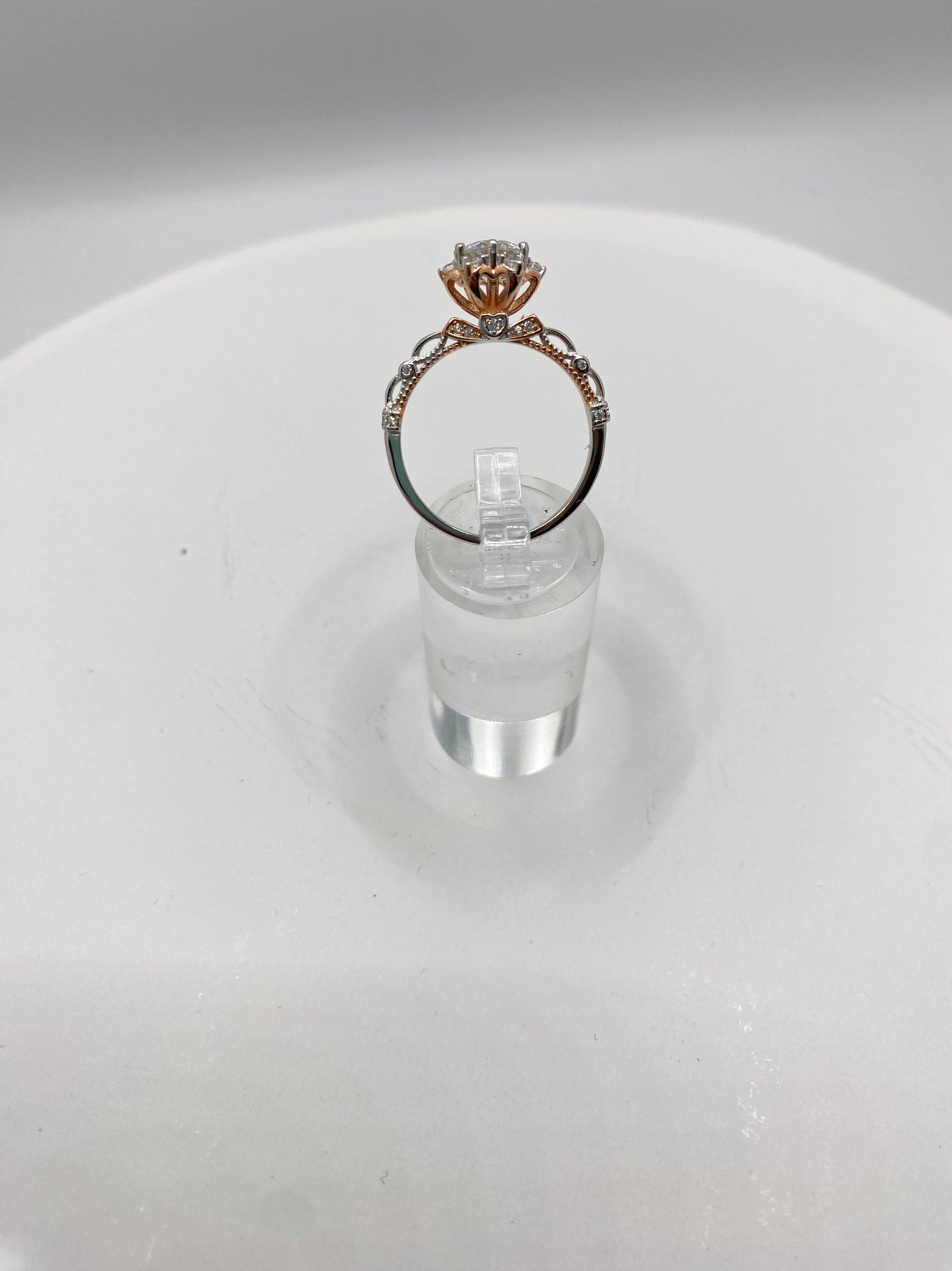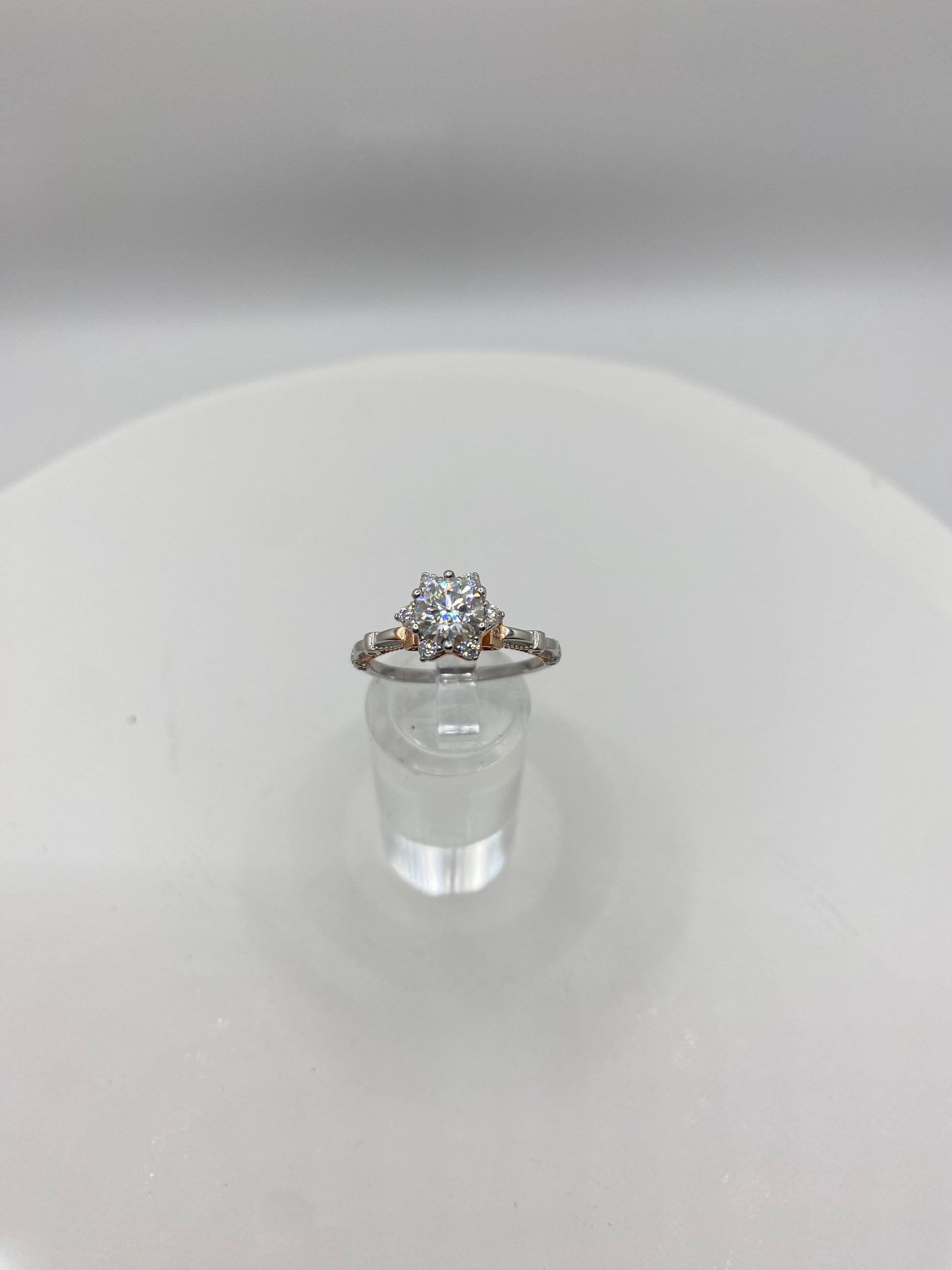 Indulge in luxury with Fatima, featuring a brilliant two toned moissanite with a 1 carat center stone and a total weight of 2 carats. The S925 Rose Gold setting adds a touch of elegance. Enjoy the clarity of VVS1 and make a statement with this exclusive piece.