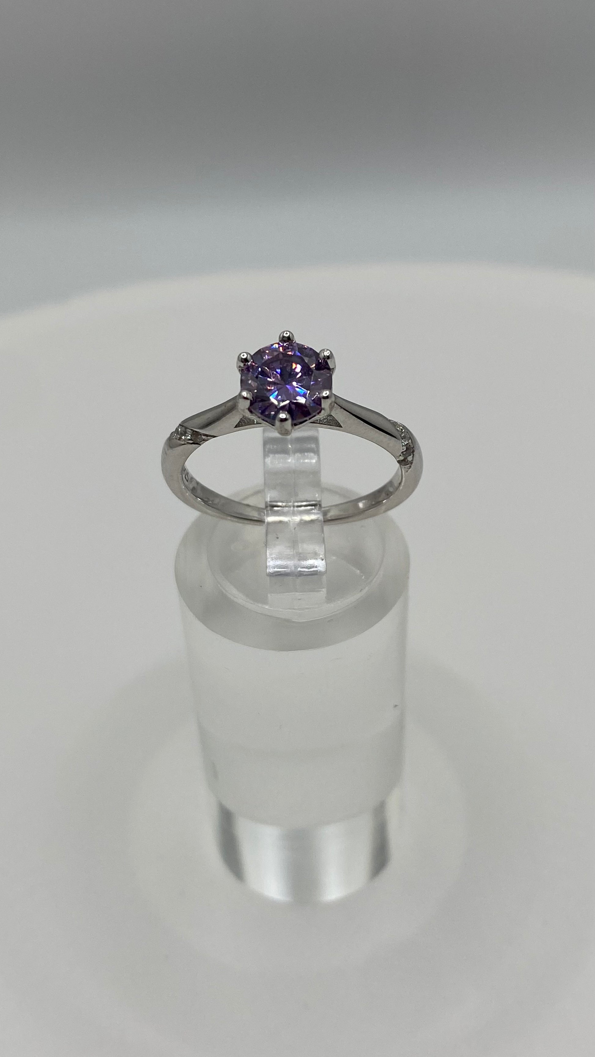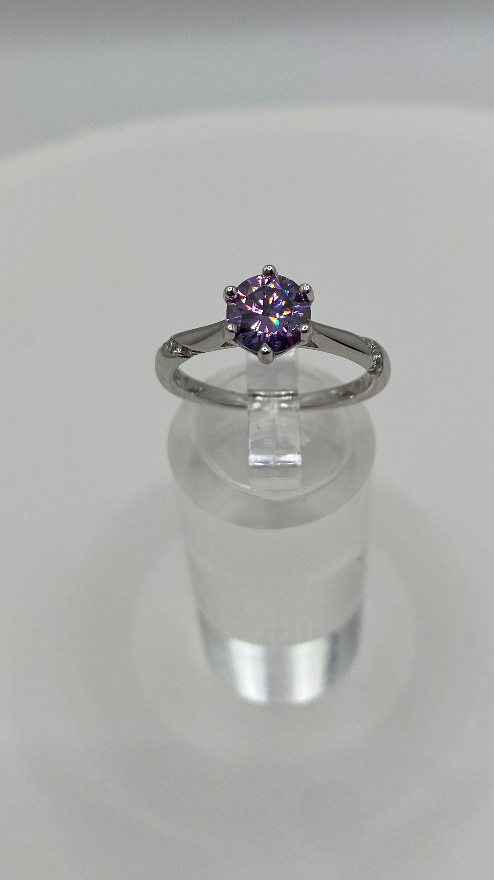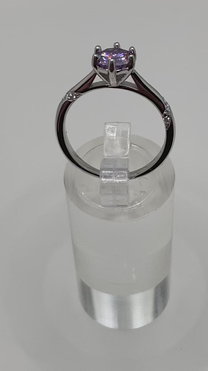 Take your style to the next level with Farrah - a daring and eye-catching piece. Adorned with a stunning 1 carat purple Moissanite stone, set in sterling silver, this ring sparkles like no other. Its excellent cut and vvs1 color make it pass the diamond test with ease.