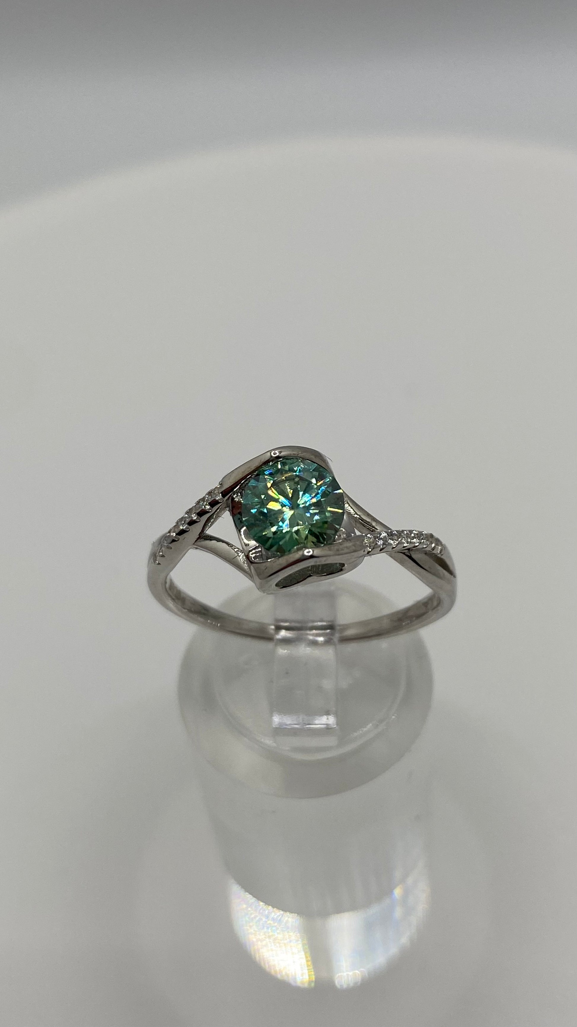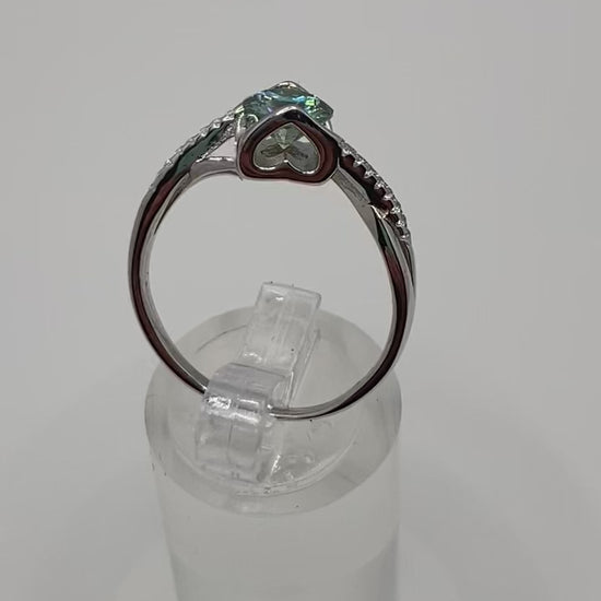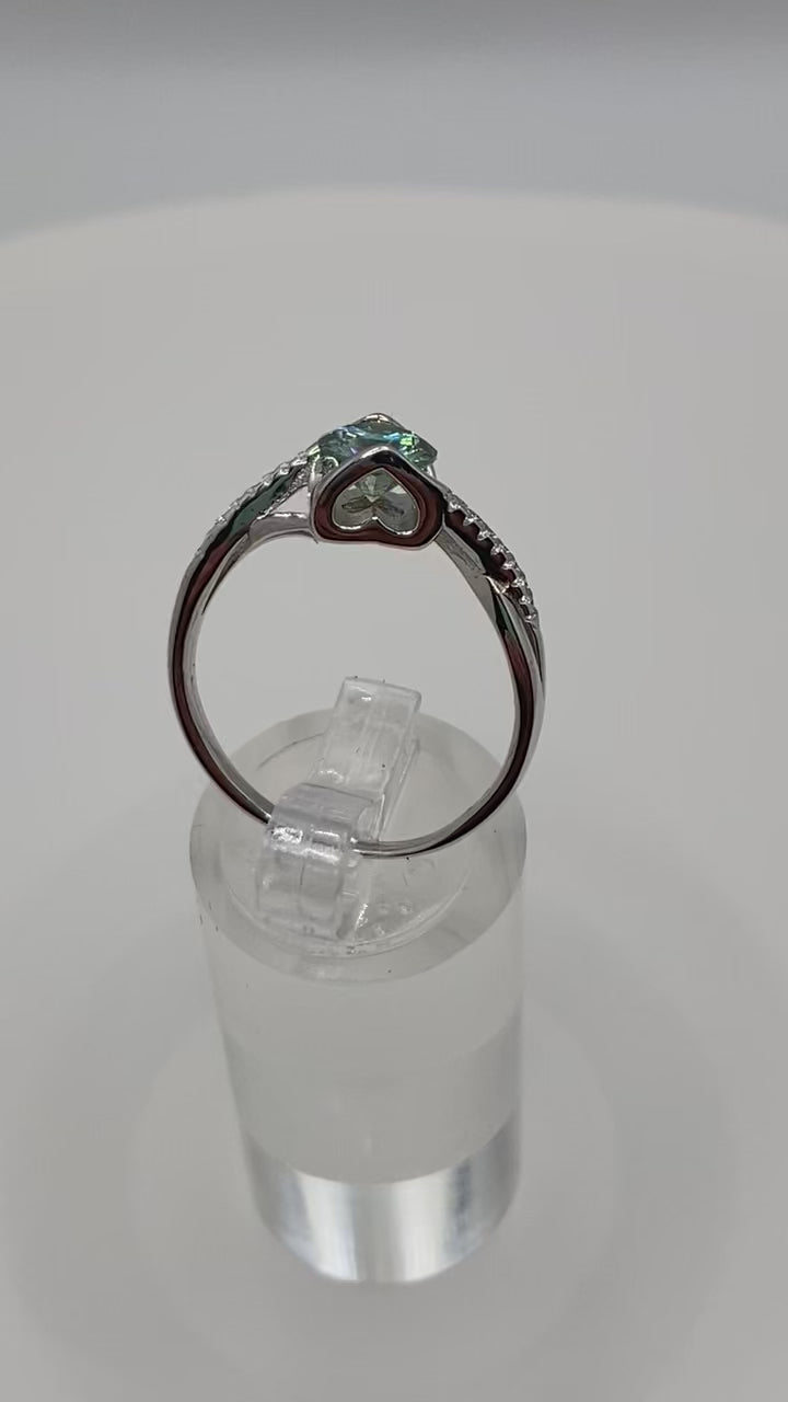 Fall head over heels for the enchanting beauty of Larsa. Adorned with a 1 CT turquoise moissanite stone, and surrounded by a heart-shaped silhouette, this lovingly-crafted piece will surely capture your heart. Guaranteed to sparkle and shine, just like your love.