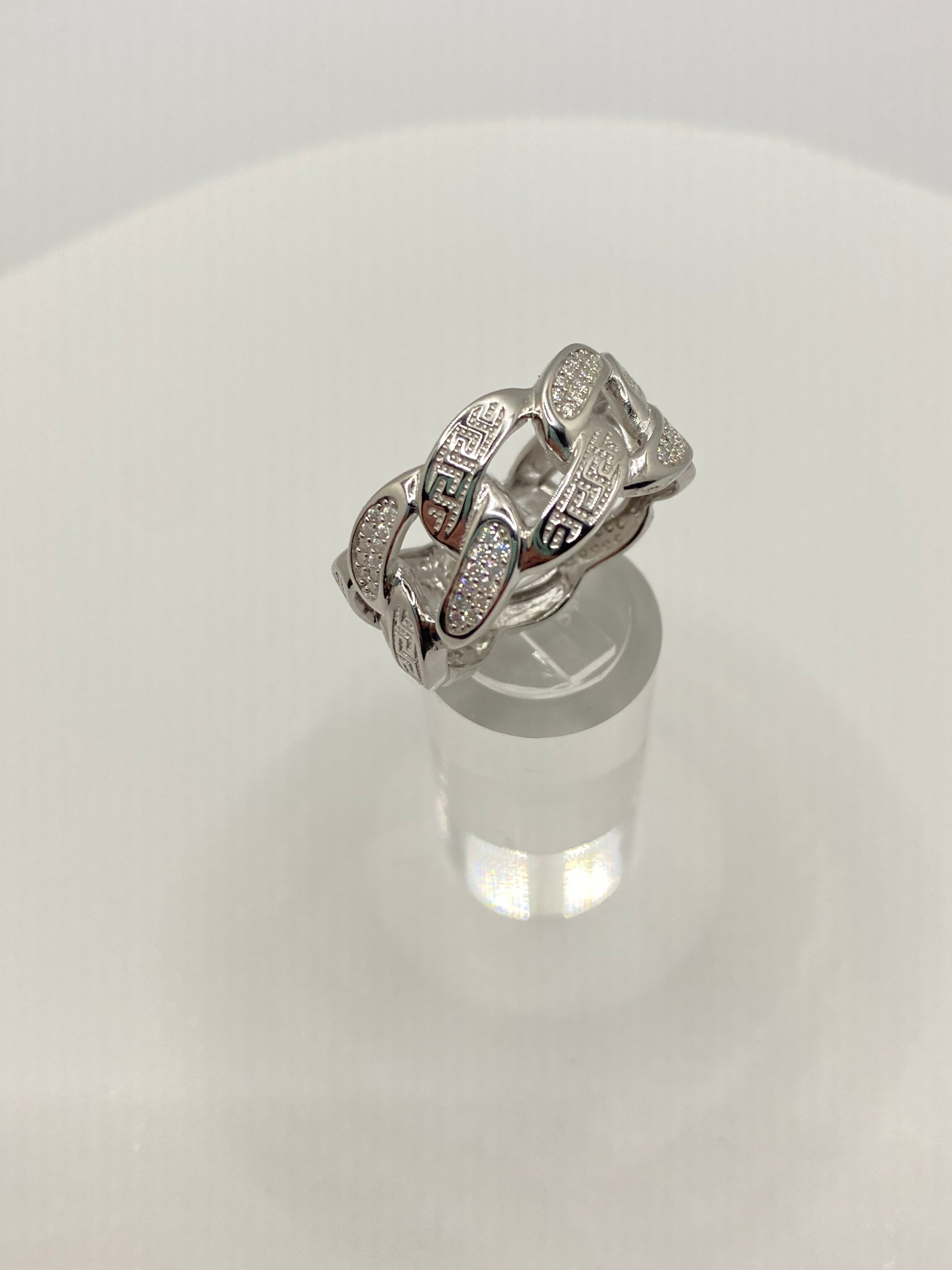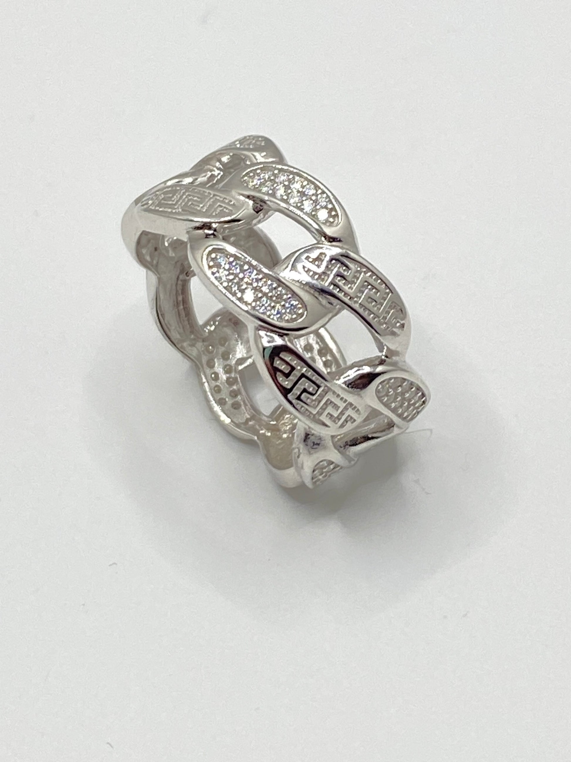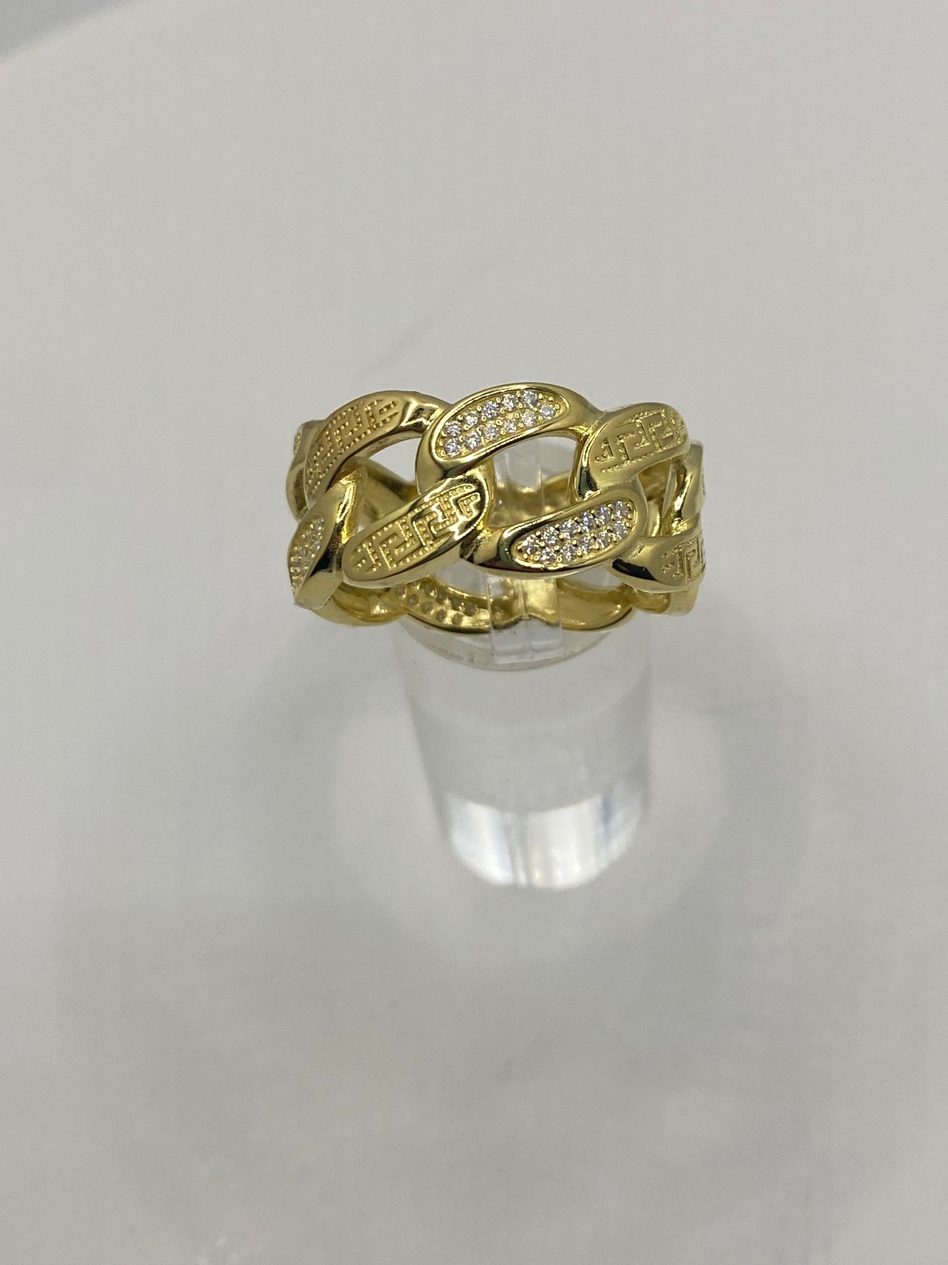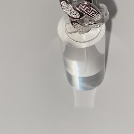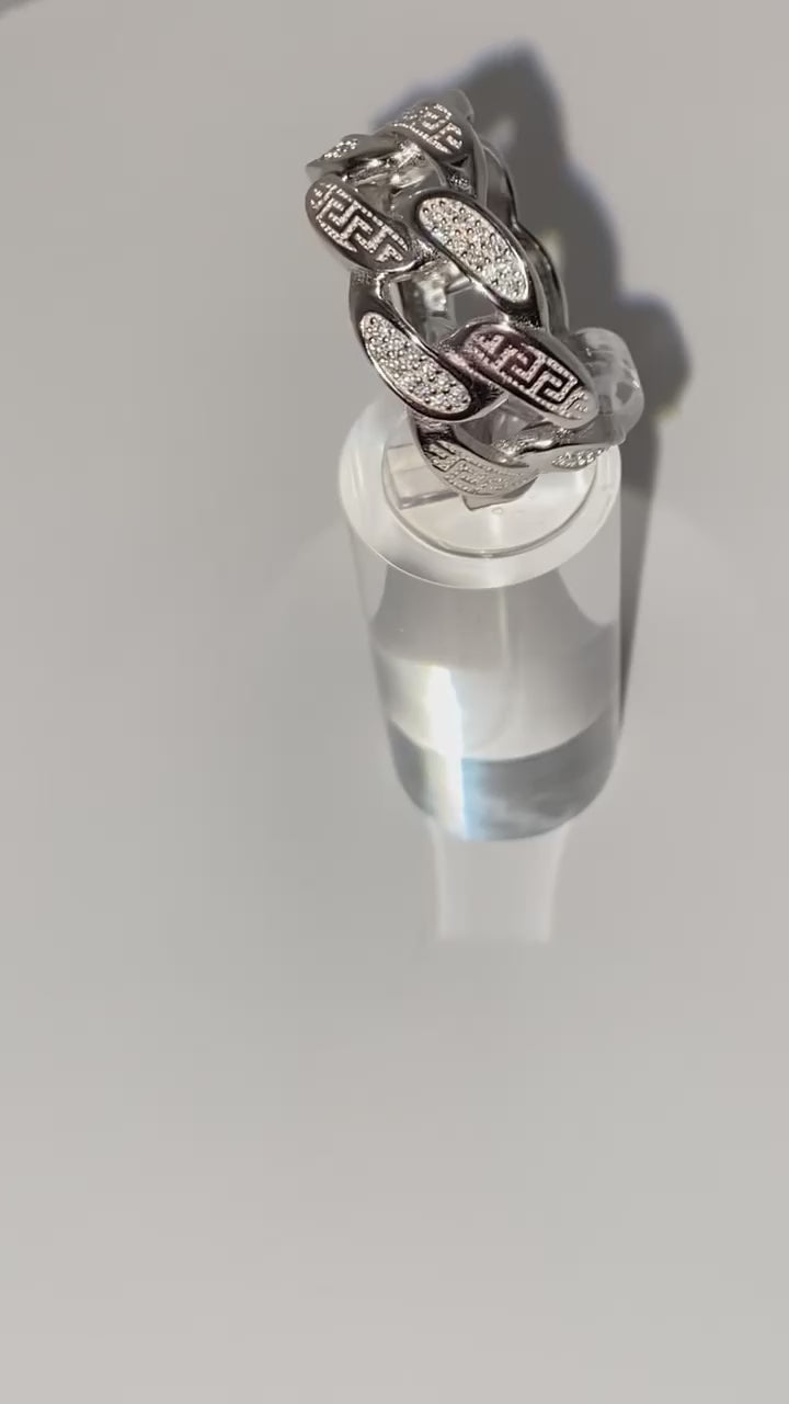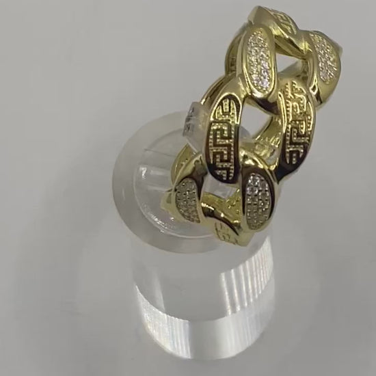 The ultimate embodiment of style, this exquisite ring boasts a timeless Cuban chain pattern comprised of interlocking oval links that create an elegant and cohesive band. Meticulously crafted with luxurious gold over 925 or sterling silver, the design evokes a classic Greek-inspired aesthetic. Adorned with top-grade moissanite stones, each diamond-tested for superior quality and boasting a VVS1 clarity, this ring ensures the utmost in sophistication and grace.
