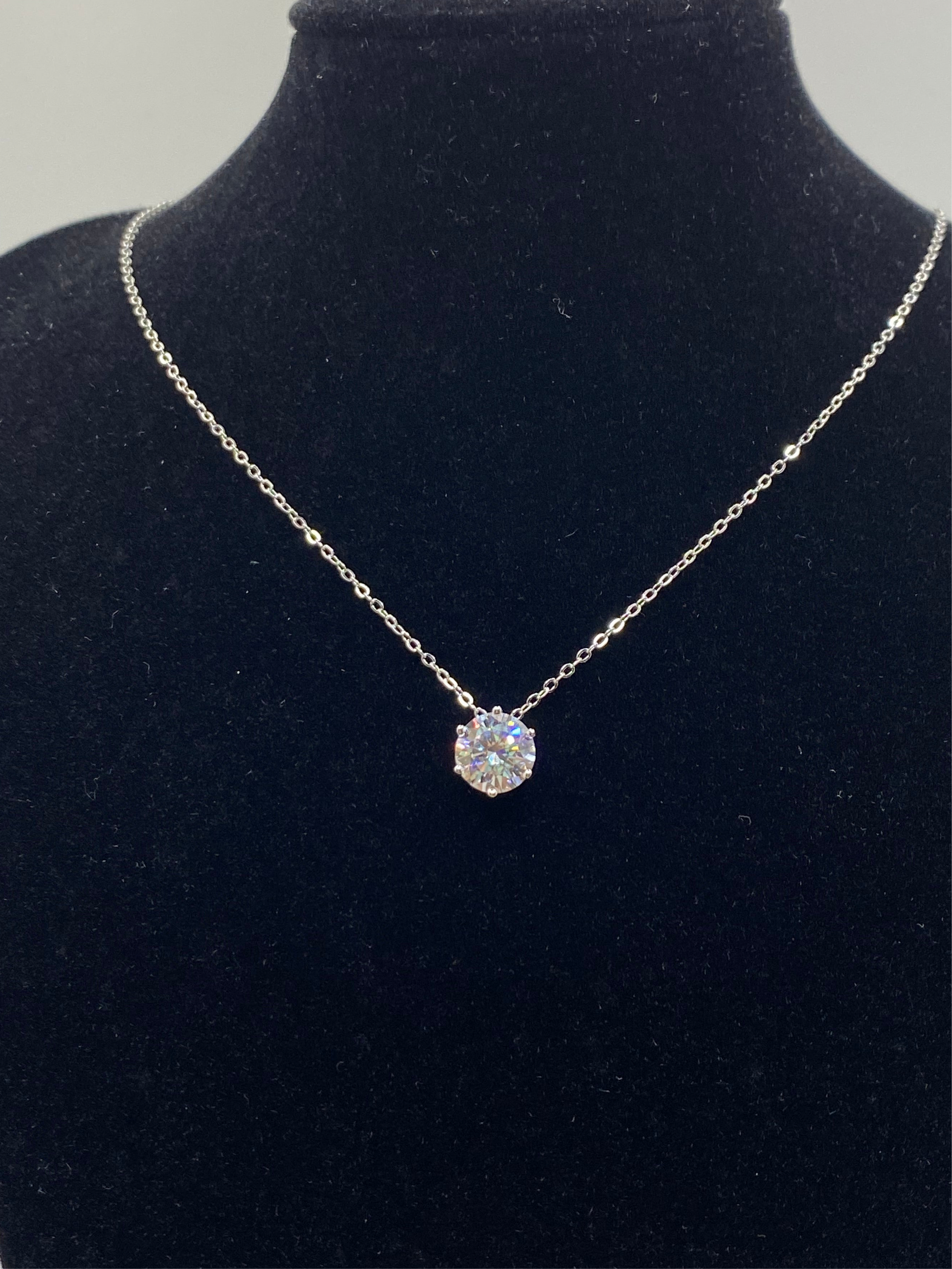 Elevate your style with our 2 carat moissanite solitaire pendant, featuring a VVS1 clarity, D color stone. This piece is diamond tested and GRA certified, ensuring its superior quality. Suspended on a sleek adjustable 18-inch 925 sterling silver chain, this necklace exudes understated elegance for any occasion.