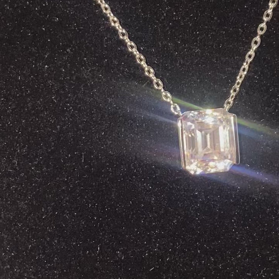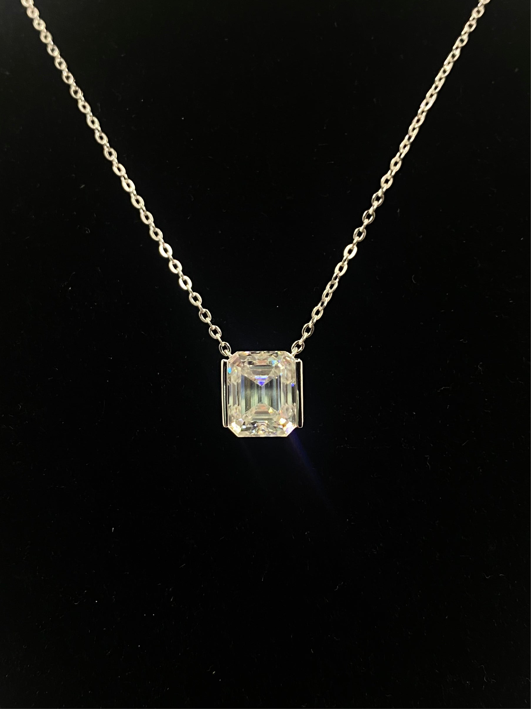 Elevate your style with our elegant Emerald Solitaire necklace. Featuring a stunning 5 carat emerald cut moissanite stone on an 18" 925 chain, this VVS1 quality necklace is the perfect statement piece for any occasion. Add a touch of sophistication to your wardrobe with this exquisite Solitaire necklace.