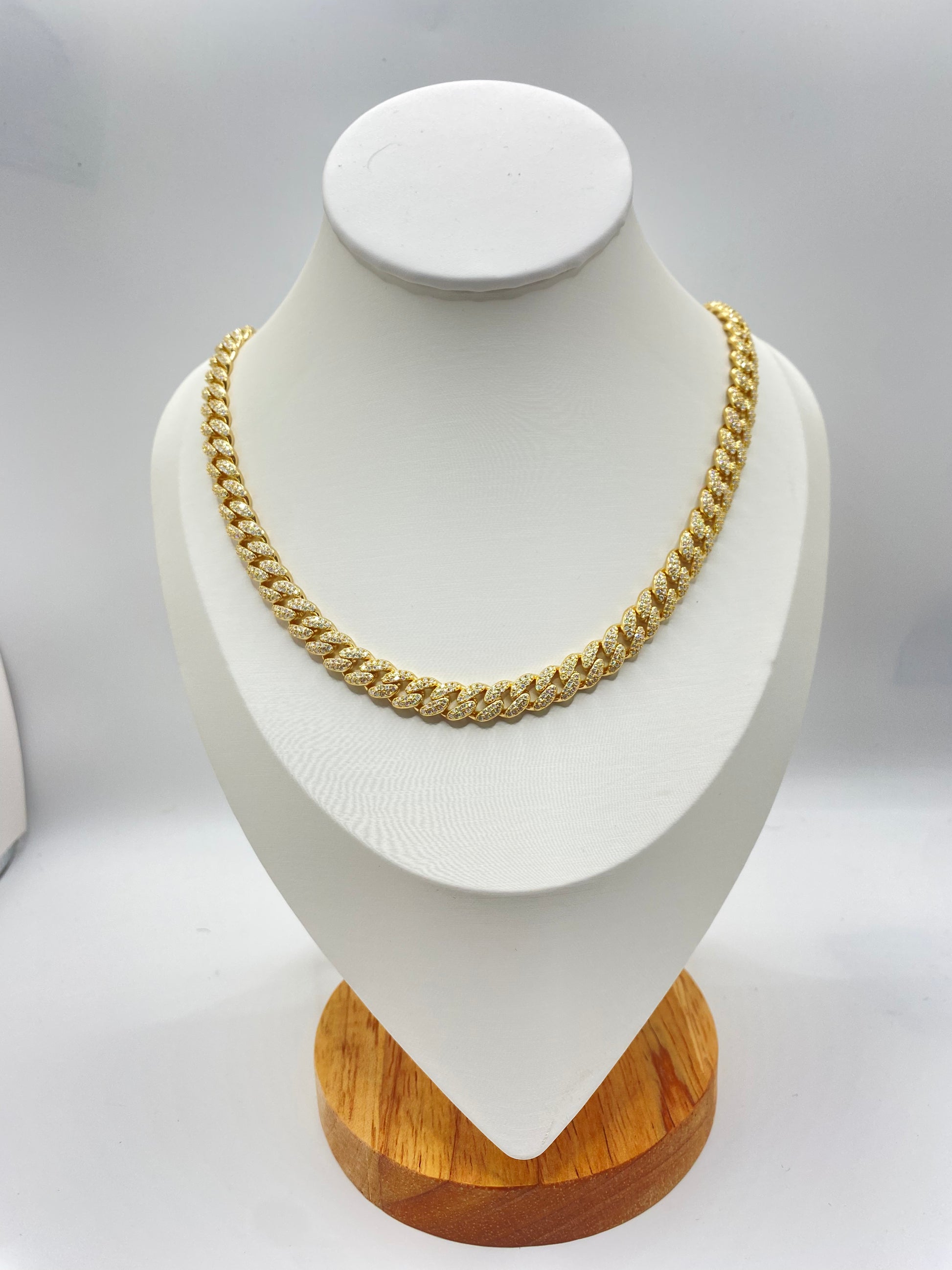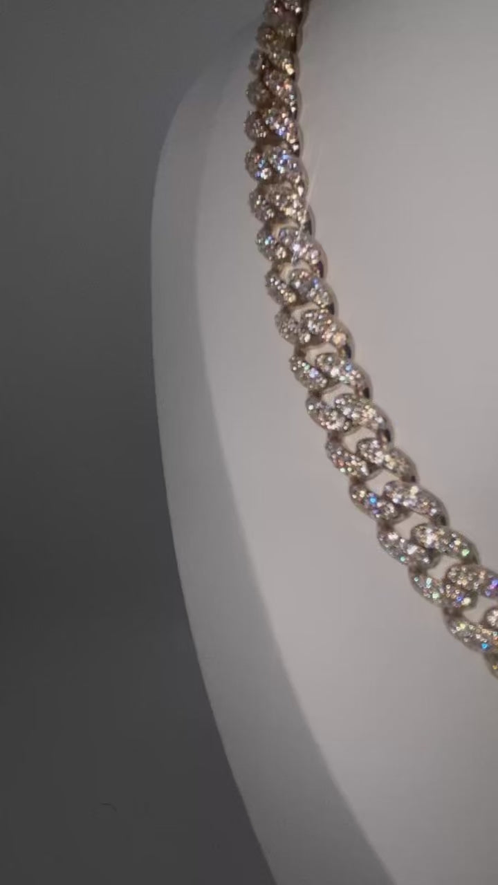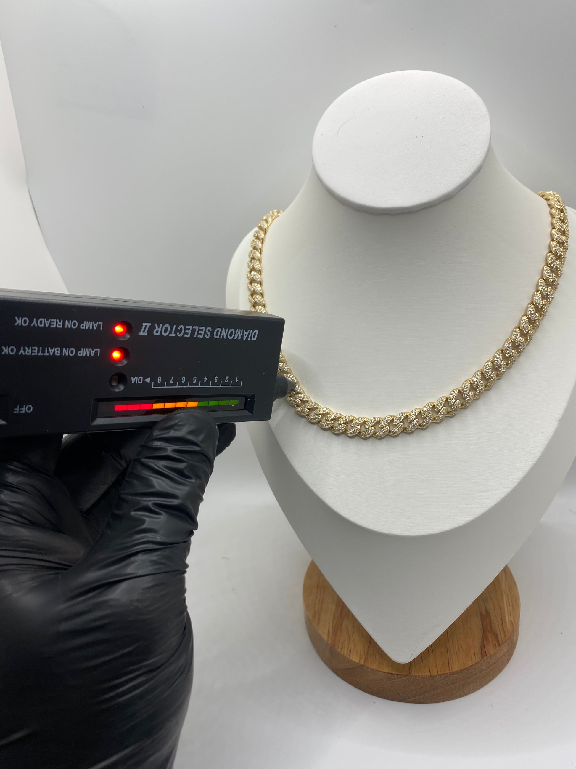 This 18k Gold Vermeil Moissanite Miami Cuban necklace boasts a dazzling 8mm width and 2 rows of sparkling VVS1 D Color moissanite stones. Measuring 24" long, this necklace is the perfect statement piece for any occasion. Diamond tested for guaranteed quality and brilliance.