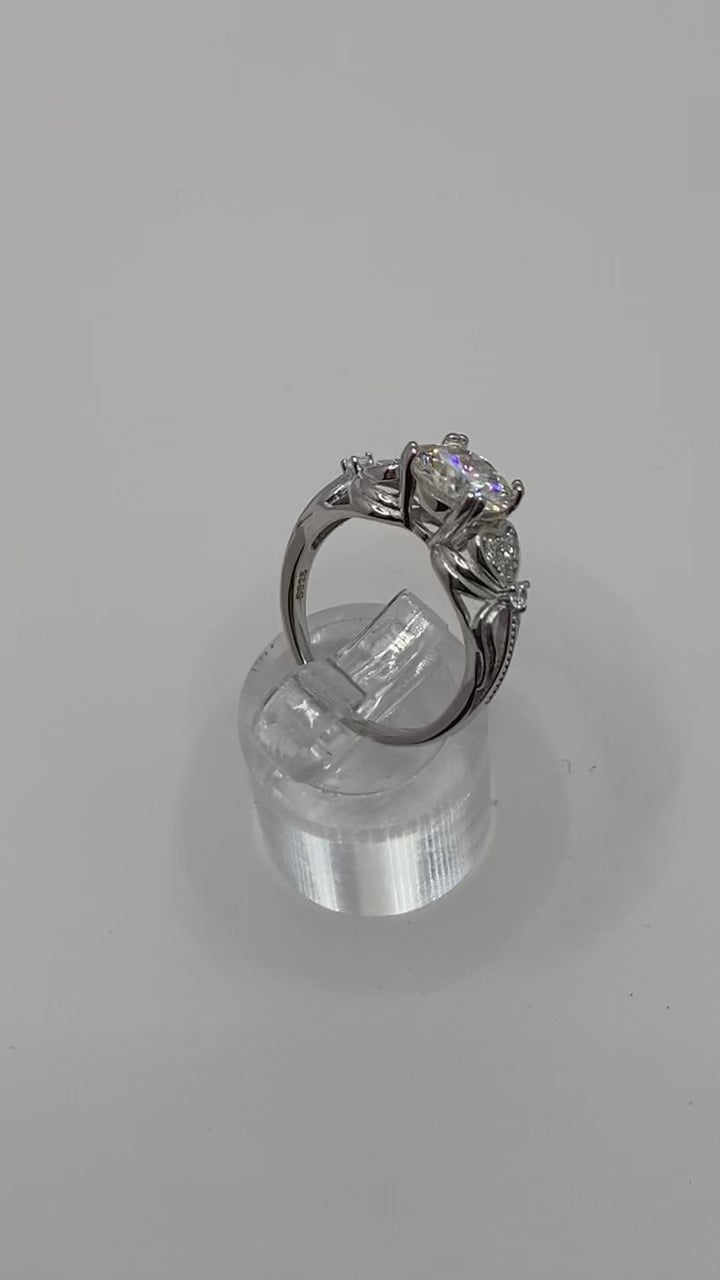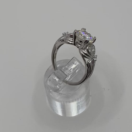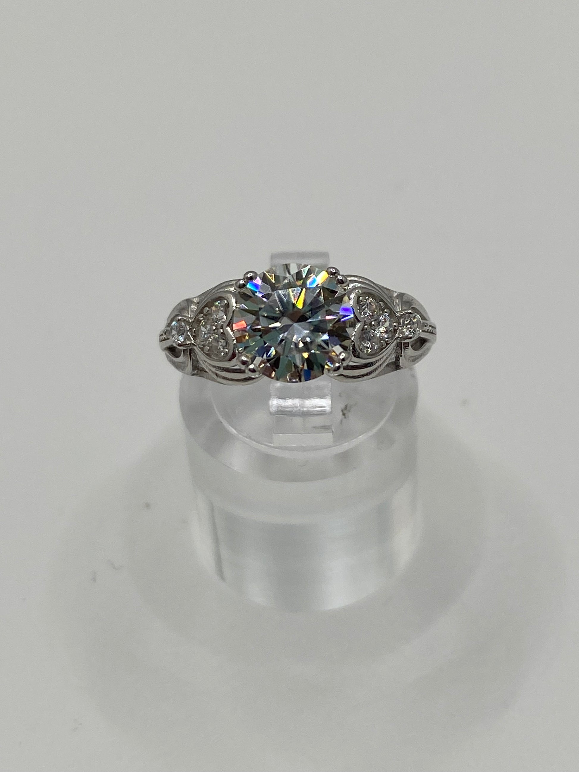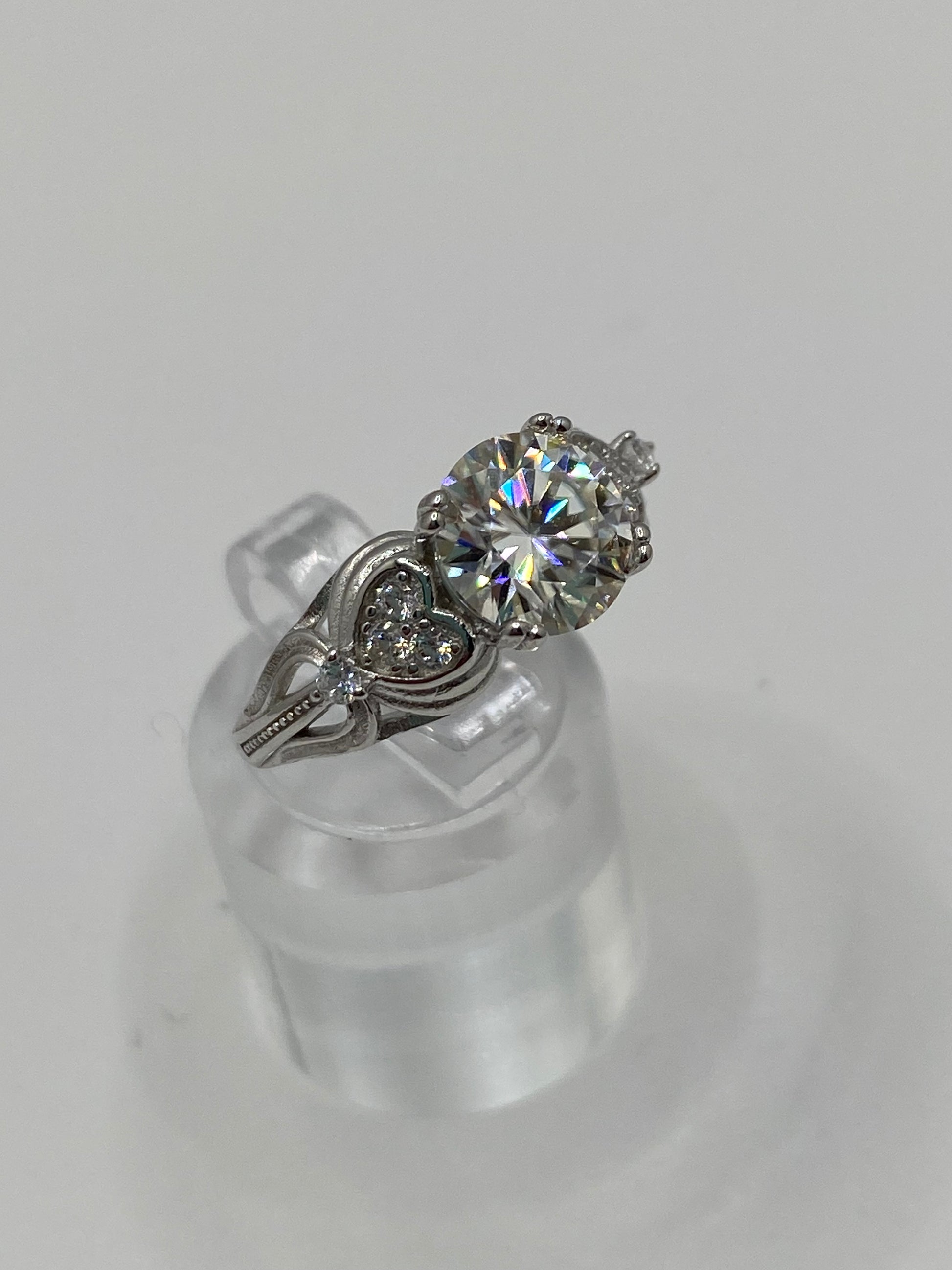 Experience timeless beauty with Mirta. This exquisite ring showcases a dazzling 2 carat round center stone, complimented by a 2.3 total carat weight of shimmering moissanite and VVS1 clarity diamonds. Available in size 6 and 7.5. Elevate your style with Mirta.