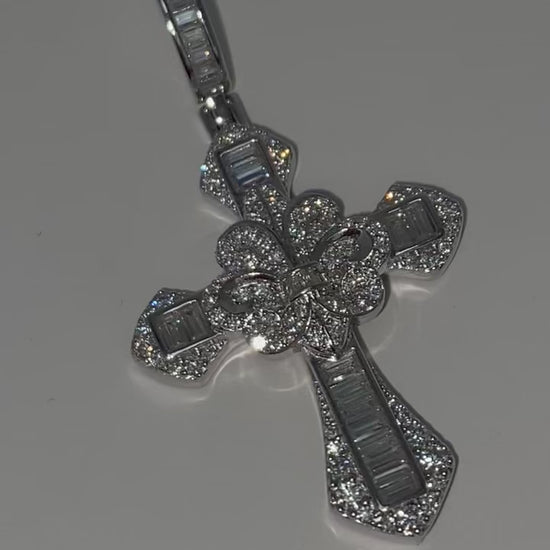 Exuding elegance and heritage, this Saint Cross Pendant is masterfully crafted in 925 sterling silver and adorned with a refined blend of baguette and round brilliant moissanite cuts. At its heart lies a fleur-de-lis inspired design, a timeless emblem reminiscent of New Orleans artistry and tradition. The intricate setting creates a radiant display of light, offering both sophistication and brilliance. Finished with a versatile 8.3 x 6 mm bail, this pendant is designed to pair seamlessly with fine chains, making it a distinguished statement piece for those who demand luxury and meaning in every detail.